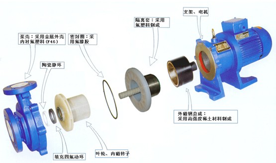 氟塑料磁力泵由泵、磁力傳動器、電動機三部分組成。關(guān)鍵部件磁力傳動器由外磁轉(zhuǎn)子、內(nèi)磁轉(zhuǎn)子及不導(dǎo)磁的隔離套組成。當(dāng)電動機帶動外磁轉(zhuǎn)子旋轉(zhuǎn)時,磁場能穿透空氣隙和非磁性物質(zhì),帶動與葉輪相連的內(nèi)磁轉(zhuǎn)子作同步旋轉(zhuǎn),實現(xiàn)動力的無接觸傳遞,將動密封轉(zhuǎn)化為靜密封。由于泵軸、內(nèi)磁轉(zhuǎn)子被泵體、隔離套完全封閉,從而徹底解決了“跑、冒、滴、漏”問題,消除了煉油化工行業(yè)易燃、易爆、有毒、有害介質(zhì)通過泵密封泄漏的安全隱患,有力地保證了職工的身心健康和安全生產(chǎn)。