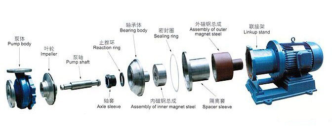 CQB磁力驅(qū)動(dòng)離心泵(簡稱磁力泵),通常由電動(dòng)機(jī),磁力偶合器和耐腐蝕離心泵組成。其主要特點(diǎn)是利用磁力偶合器傳遞動(dòng)力,完全無泄漏,當(dāng)電動(dòng)機(jī)帶動(dòng)磁力偶合器的外磁鋼旋轉(zhuǎn)時(shí),磁力線穿過問隙和隔離套,作用于內(nèi)磁鋼上,使泵轉(zhuǎn)子與電動(dòng)機(jī)同步旋轉(zhuǎn),無機(jī)械接觸地傳遞扭矩。在泵軸的動(dòng)力輸入端,由于液體被封閉在靜止的隔離套內(nèi),沒有動(dòng)密封因而完全無泄漏。