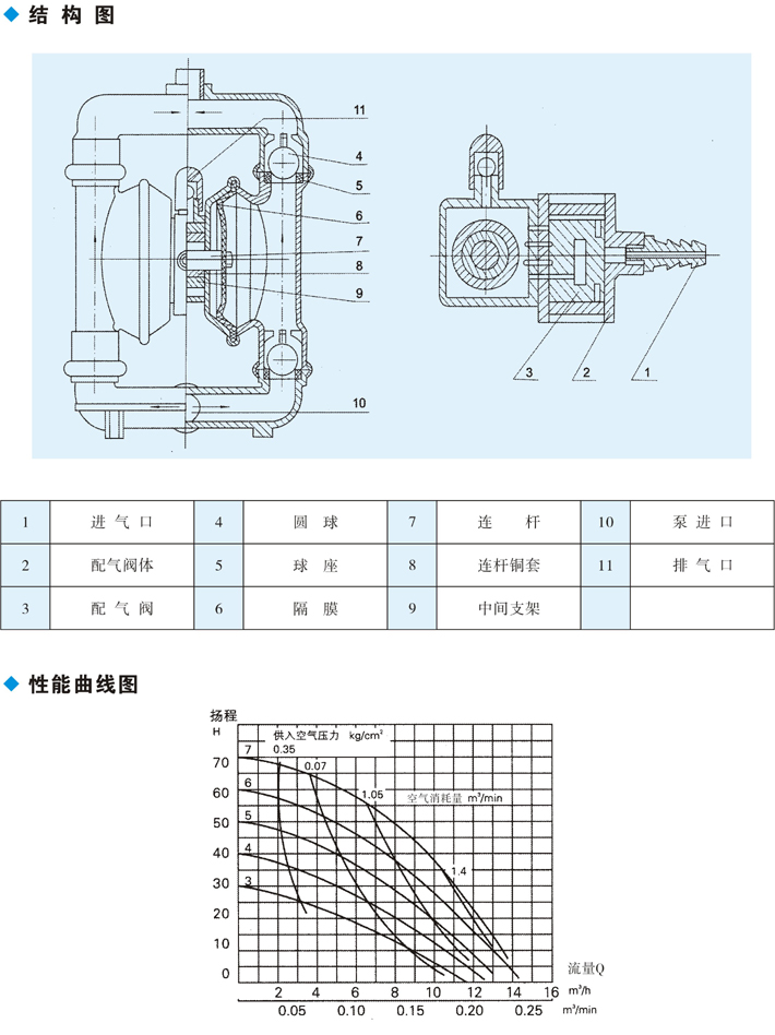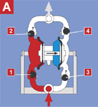 ? 在圖中壓縮空氣由進(jìn)口進(jìn)入配氣閥,使膜片向右運(yùn)動(dòng),則A室吸力使介質(zhì)由C入口流入,推開球閥2進(jìn)入A室,球閥4則因吸入閉鎖,B室中的介質(zhì)則被擠壓,推開球閥3由D流出同時(shí)使1閉鎖,防止回流,就這樣循環(huán)往復(fù)使介質(zhì)不斷從C入口吸入D出口出排出。