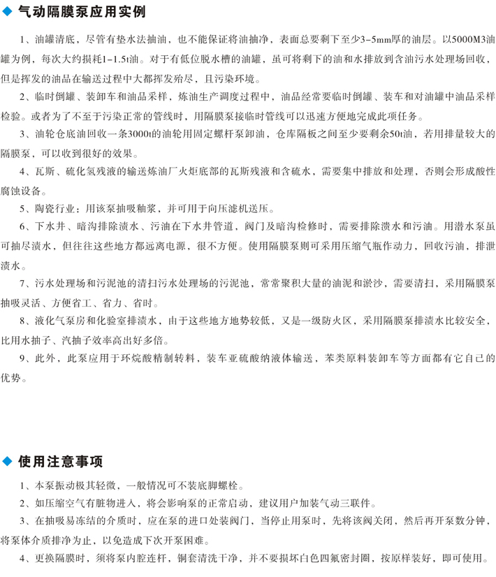 ?QBY襯氟F46氣動(dòng)隔膜泵概述 ?QBY襯氟F46氣動(dòng)隔膜泵是一種新型輸送機(jī)械,是目前國(guó)內(nèi)最新穎的一種泵類。采用壓縮空氣為動(dòng)力源,對(duì)于各種腐蝕性液體,帶顆粒的液體,高粘度、易揮發(fā)、易燃、劇毒的液體,均能予以抽光吸盡。其性能參數(shù)與聯(lián)邦德國(guó)的 WLLDENPVMPS、美國(guó)的MARIOWPUMPS相近.本廠目前已形成系列化生 產(chǎn),共有八種規(guī)格直徑:¢10mm3/8"、¢15mm1/2"、¢25mm1"、¢40mm11/2"、¢50mm2"、¢65mm21/2"、¢80mm3"、¢100mm4"。四種材質(zhì)、鋁合金、鑄鐵、工程塑料、不銹鋼。根據(jù)不同液體介質(zhì)分別采用丁晴橡膠、氯丁橡膠、氟橡膠、聚四氟乙烯。以滿足不同用戶的需要。自1986年投產(chǎn)以來,已被國(guó)內(nèi)一千多家石油、化工、電子、陶紡織系統(tǒng)單位采用,安置在種特殊場(chǎng)合,用來抽送各種常規(guī)泵不能抽吸的介質(zhì),均取的了滿意的效果。 ?QBY襯氟F46氣動(dòng)隔膜泵主要用途 1、QBY氣動(dòng)隔膜泵吸花生醬、泡菜、土豆泥、小紅腸、果醬蘋果漿、巧克力等。 |